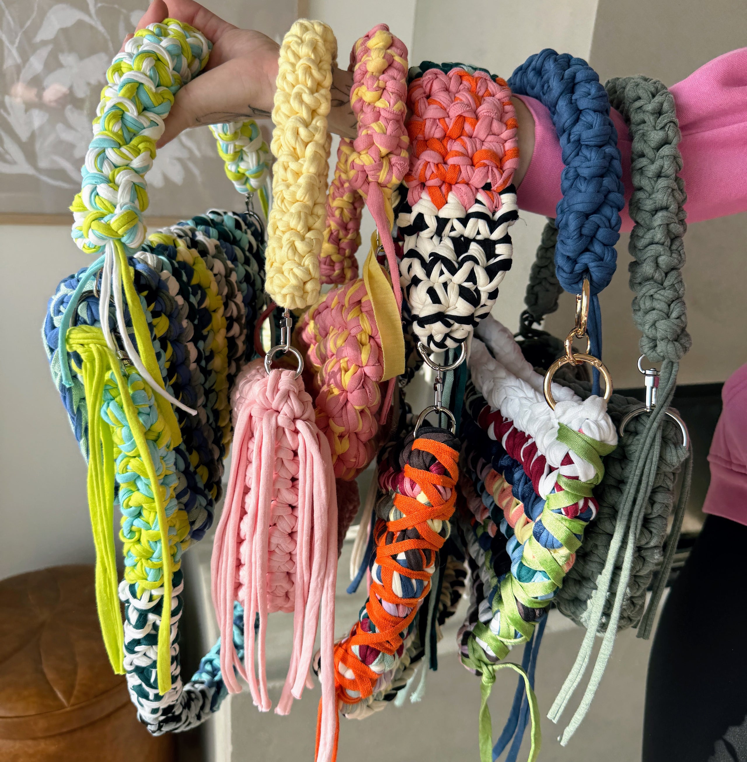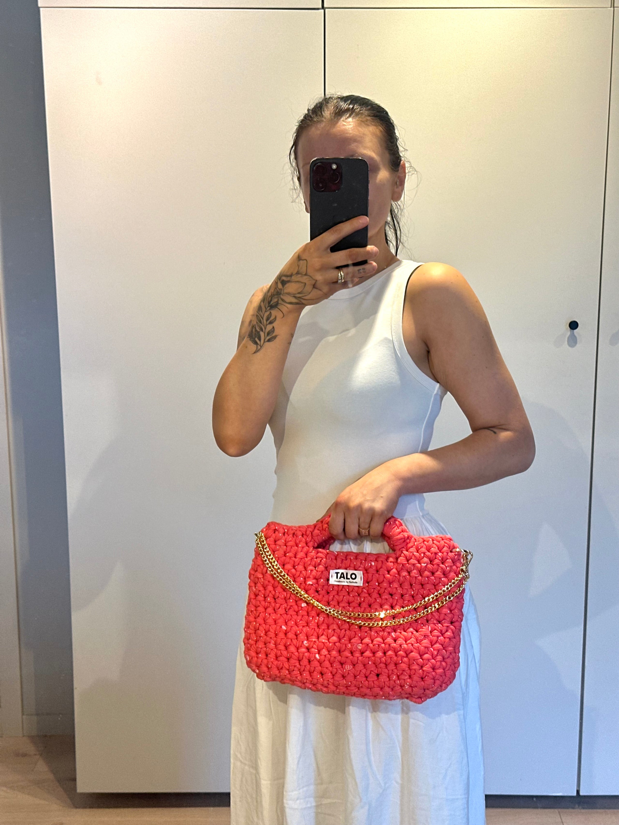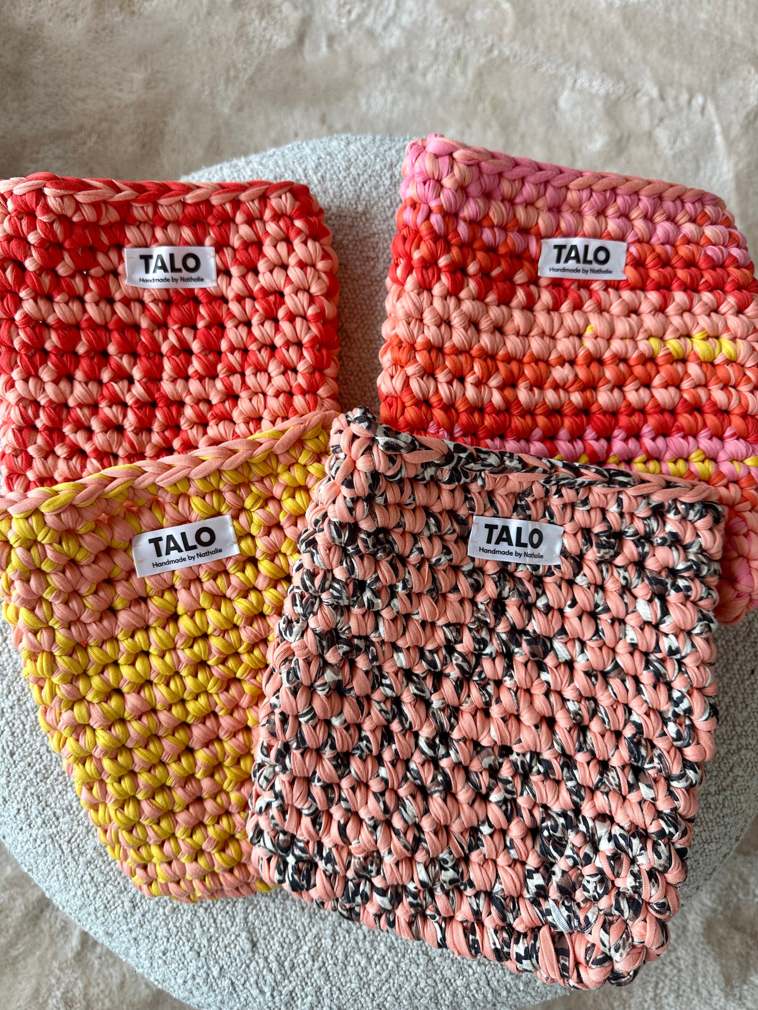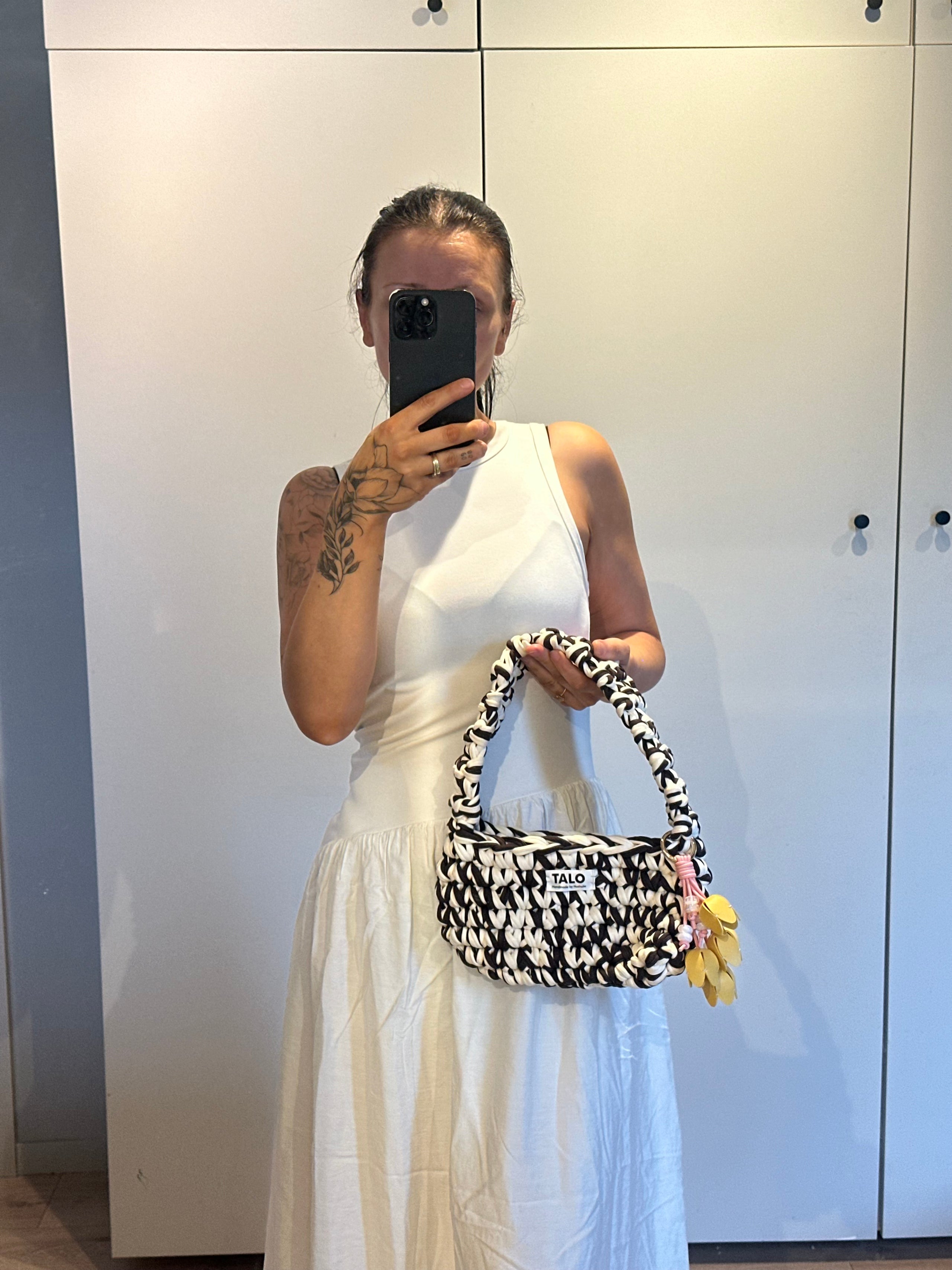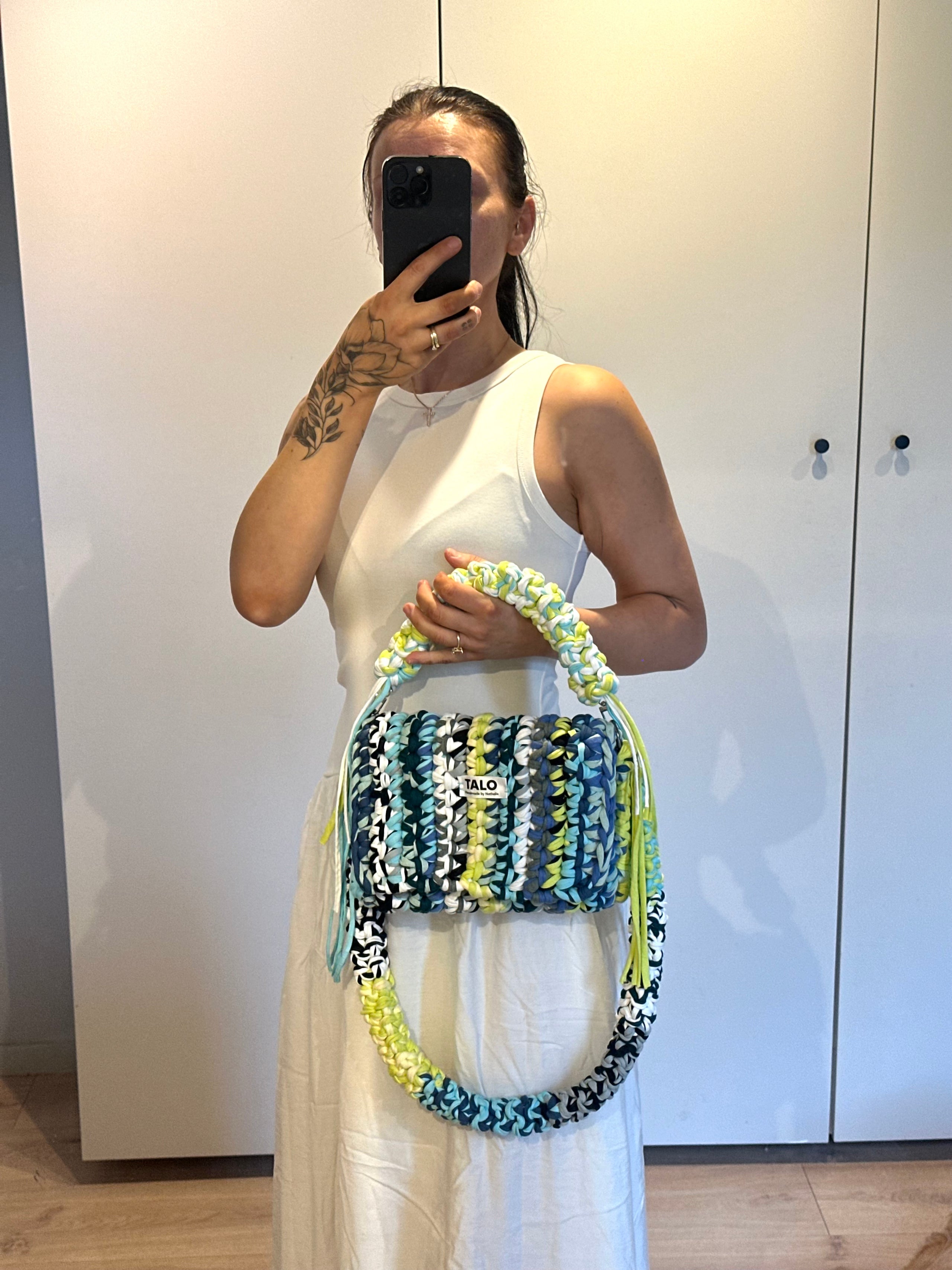 Denne håndlagde vesken er heklet i resirkulert garn fra tekstilindustrien i Europa, og kombinerer bærekraft med et lekent og moderne design.